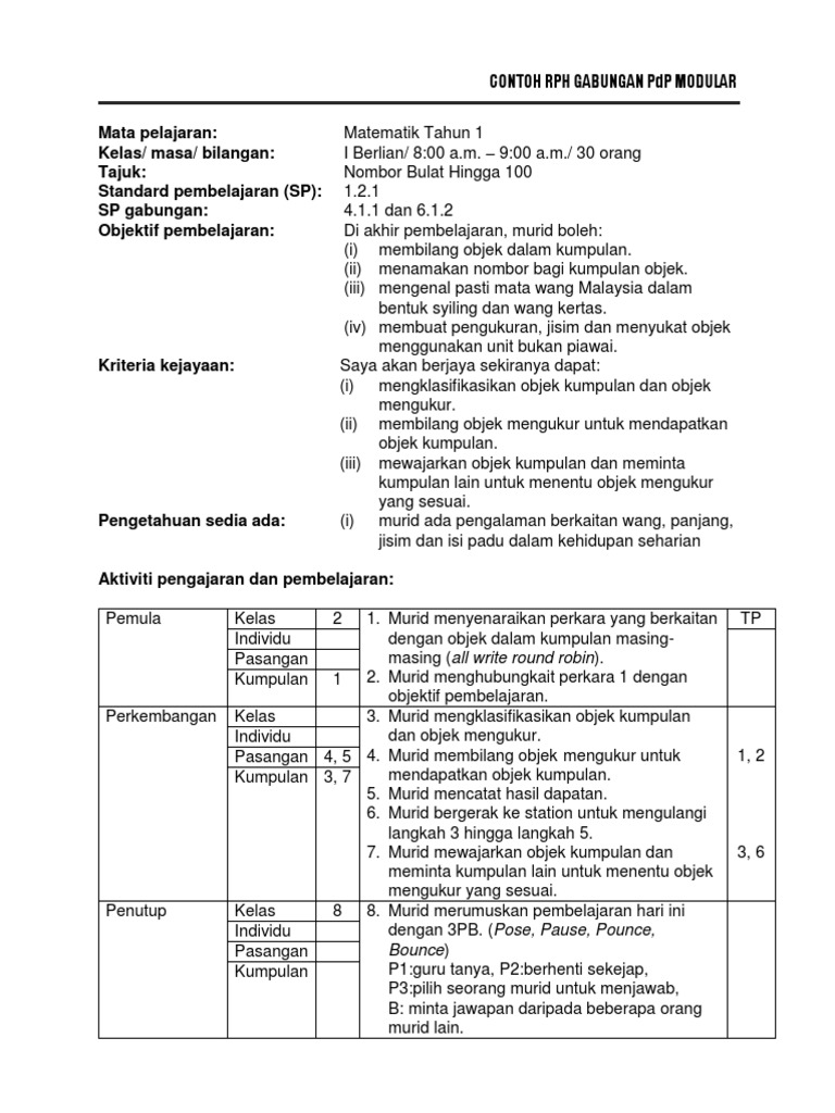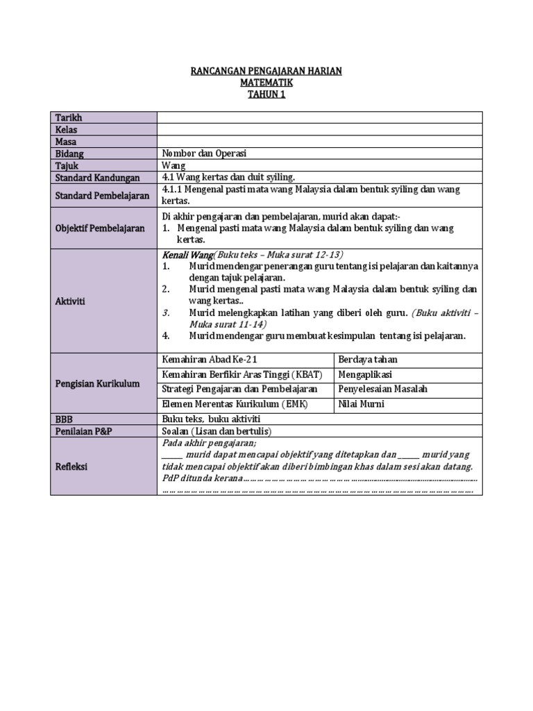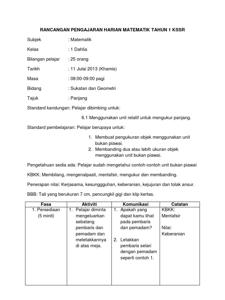 Contoh Rph Matematik Tahun 1 Isaiahctzx